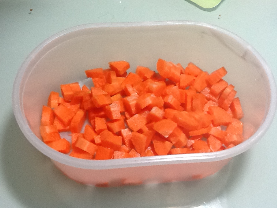 ระหว่างรอมันฝรั่งสุก ก็หั่นแครอทเป็นชิ้นเล็กๆ พองามค่ะ